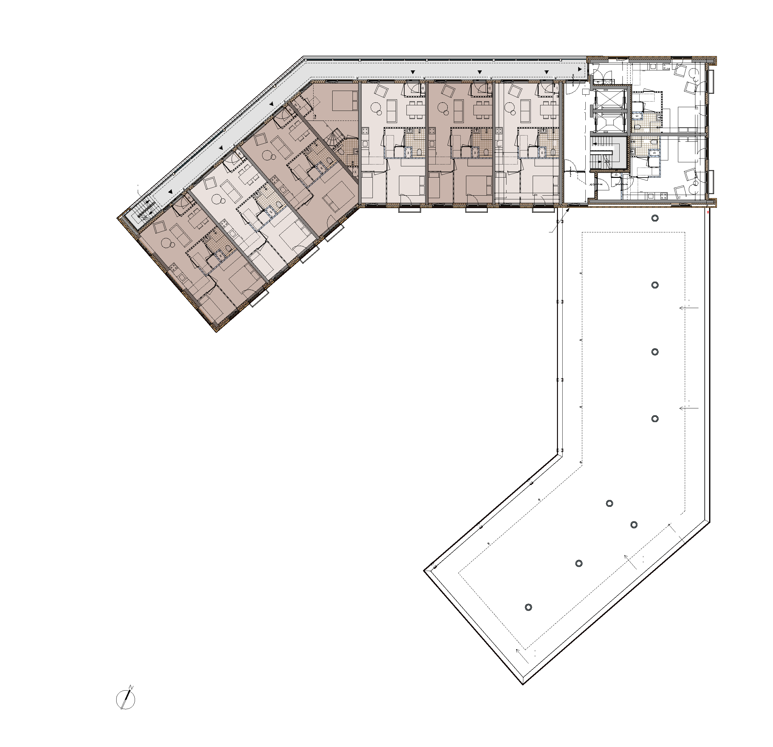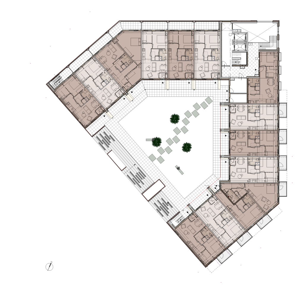 Als gevolg van de nabij gelegen snelweg A7 heeft de locatie aan de noordwestzijde een geluidsbelasting van 59 dB op de gevel. Het 8-laagse gedeelte bevindt zich aan deze zijde, als buffer naar het lagere gedeelte. De woningen aan deze zijde worden via een afgeschermde corridor ontsloten, met de buitenruimtes aan de zuidoost zijde van het binnenhof. De woningen in het lagere, 5-laagse deel hebben hun entree aan een galerij aan het binnenhof.
